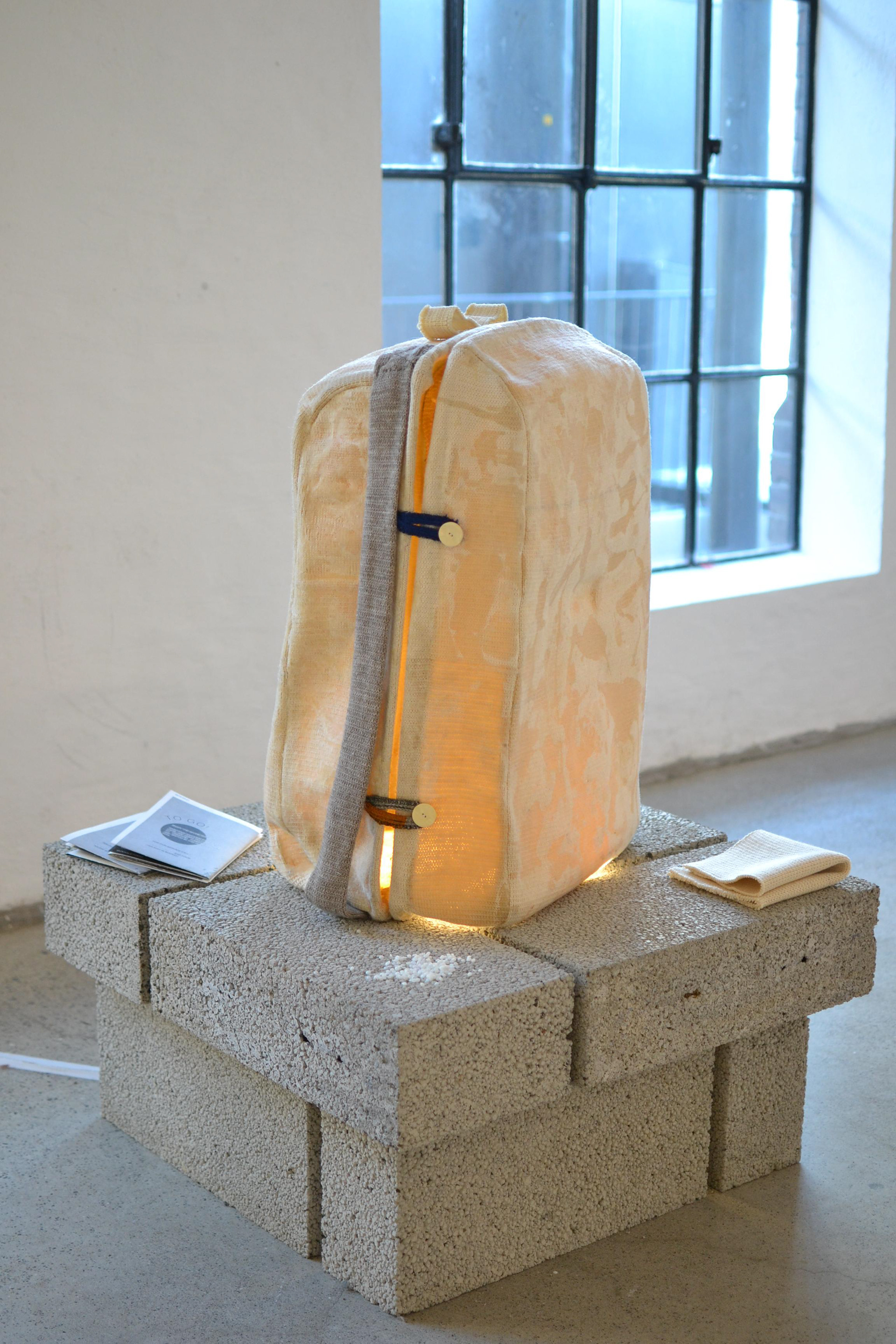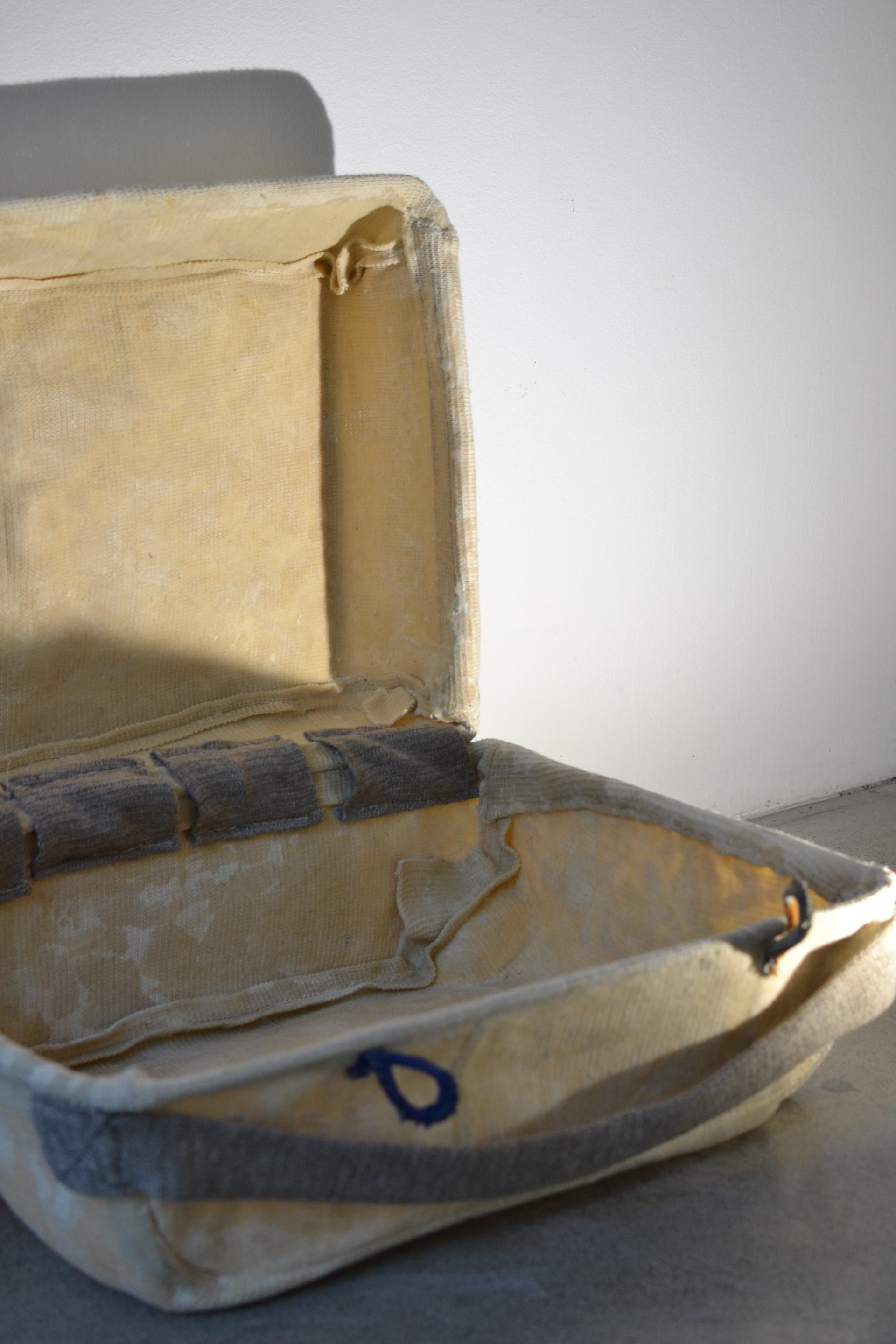 Made with wool, linnen thread on a knitting machine, shaped and molded in the original suitcase with beeswax.